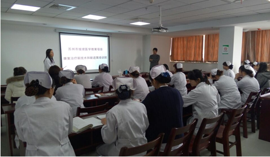 2015年3月19-20日市继续医学教育项目——康复治疗新技术和新进展培训班在苏州瑞盛康复医院举办。培训班邀请了广东工伤康复中心杨振辉主任进行康复治疗中水疗的临床应用,广东工伤康复中心兰敏灵老师讲授了职业康复在工伤康复中的应用,我院治疗部主任助理黄犇简要介绍了等速肌力测试系统的应用。